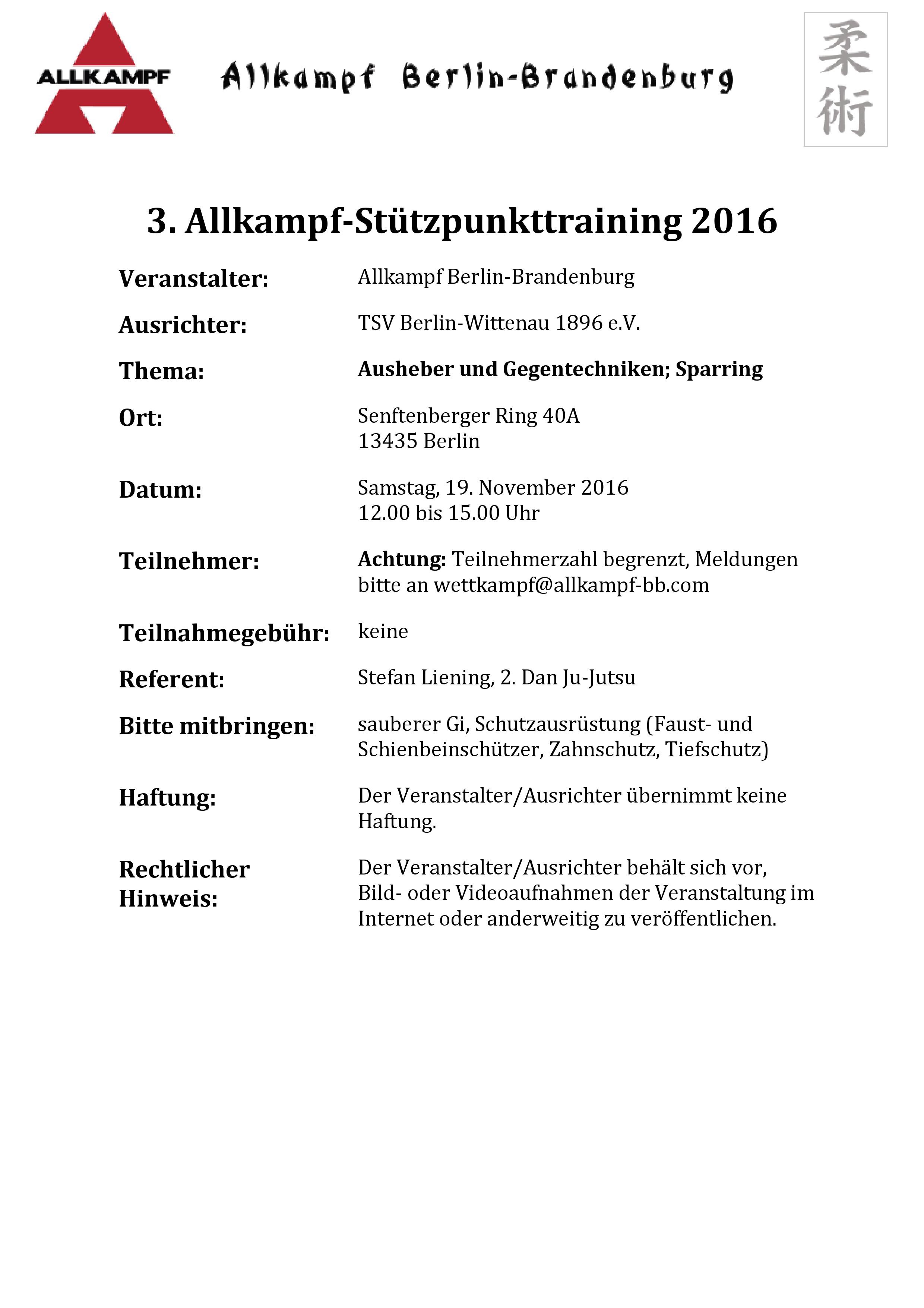 Der nächste Allkampfstützpunkt findet am 14. Januar 2018 statt, der Veranstaltungsort ist wieder die Halle des TSV Wittenau, Senftenberger Ring 40a, 13435 Berlin